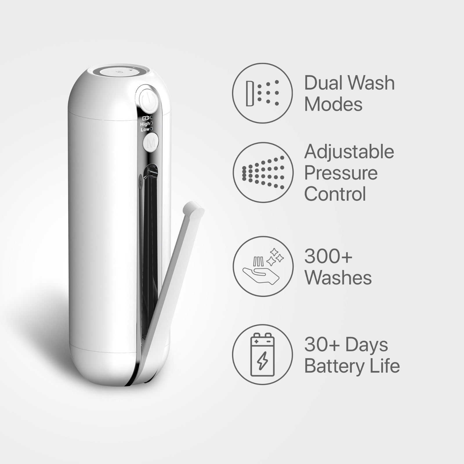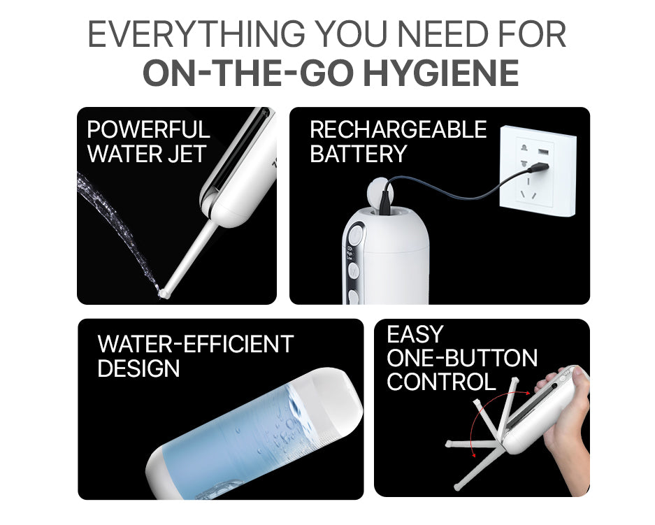 Experience ultimate cleanliness anywhere with our portable, water-efficient design. Featuring a powerful water jet and a long-lasting rechargeable battery, this compact solution ensures hygienic, chemical-free care with easy one-button control.