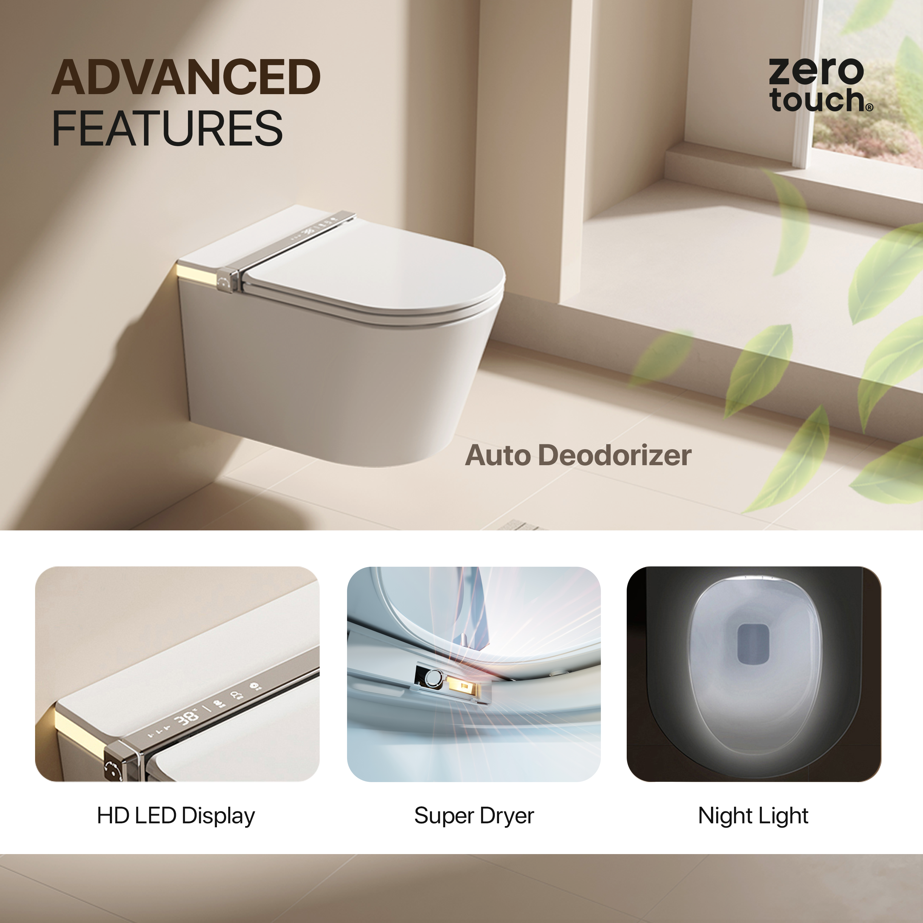 Introducing the Hygiene, India’s most advanced fully automatic wall-mounted smart toilet. Created by Zerotouch, India’s first and best-selling smart toilet brand, the Hygiene combines cutting-edge technology with sleek design to offer an unparalleled bathroom experience. With the world’s first tankless automatic flush, it not only conserves water but also optimizes your bathroom space, making it more modern, efficient, and luxurious.